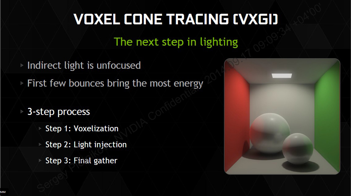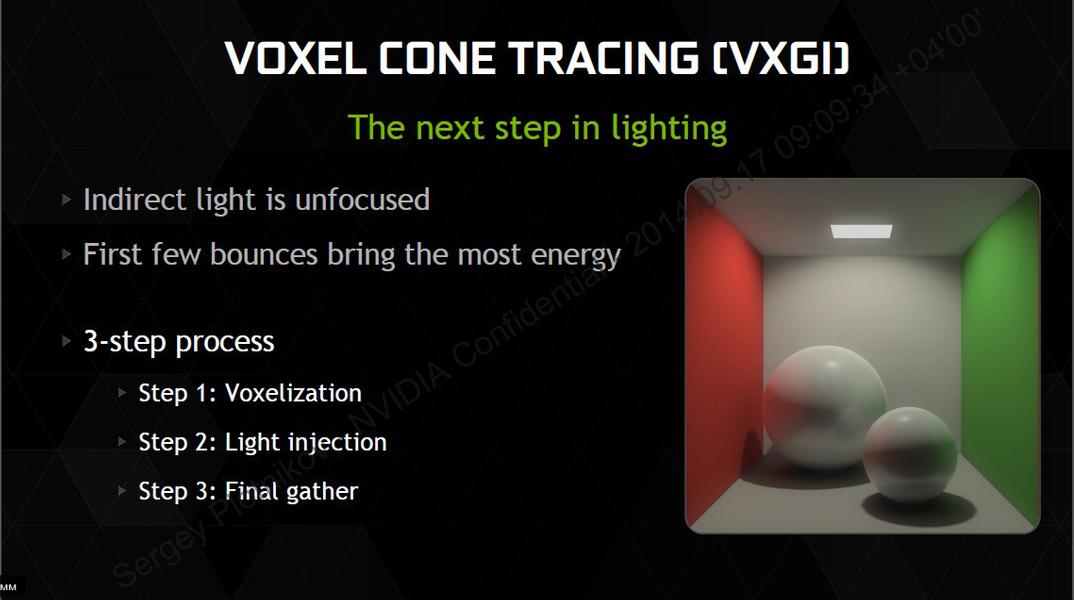 Обработка света — одна из самых тяжелых задач для компьютерной графики. С выходом видеокарт GeForce GTX 980 и GeForce GTX 970 калифорнийская компания вводит технологию Voxel Global Illumination (VXGI), разработанную Кириллом Крассиным еще в 2011 году. Суть технологии заключается в использовании 3D-структуры вокселей для захвата помещения и освещения каждой точки сцены. Как известно, вокселы являются аналогами пикселов для трехмерного пространства. GPU рассчитывает количество прямого света, отражаемого вокселями. В режиме реального времени расчитывается информация об отраженном свете. Учитываются все аспекты геометрии (тип, отражаемость, цвет и так далее). Затем происходит заливка и вывод готового результата.