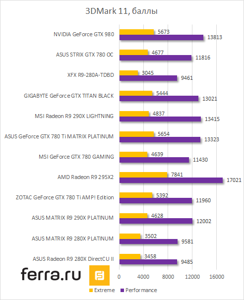 В 3DMark 11 ситуация следующая. В режиме Performance тестируемая GeForce GTX 980 оказалась самой быстрой одночиповой видеокартой, лишь немногим опередив Radeon R9 290X (Lightning-версия от MSI) и GeForce GTX 780 Ti (Matrix-версия от ASUS). Сказывается наличие более высокой тактовой частоты, которую финский бенчмарк так любит, а также оптимизация архитектуры Maxwell. А также новые драйвера. Для тестирования GeForce GTX 980 использовалась версия 344.07, а также GeForce Experience версии 2.1.1. А вот в режиме Extreme «девятьсот восьмидесятая» идет вровень с GeForce GTX 980.