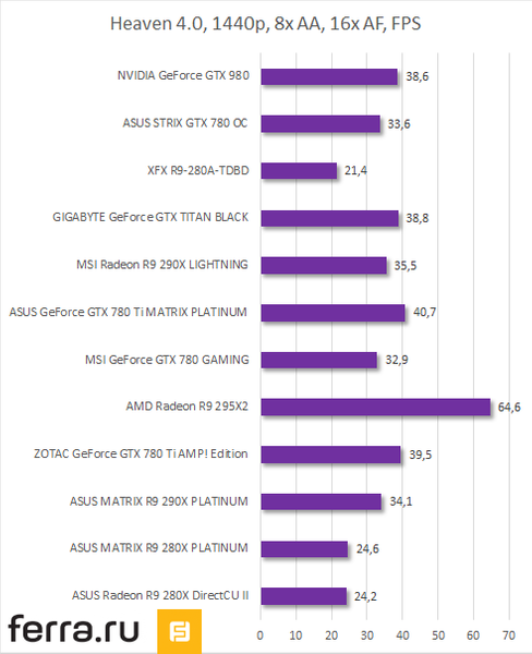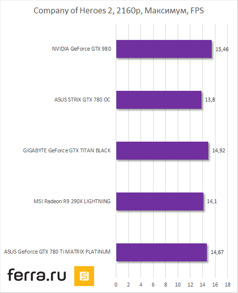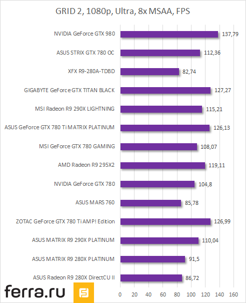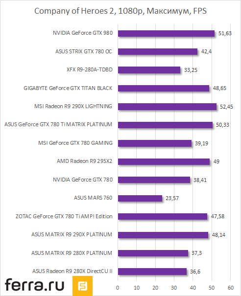 В остальных играх прослеживается схожая тенденция. Matrix-версия GeForce GTX 780 Ti от ASUS оказывается чуть быстрее референсной GeForce GTX 980, а она чуть производительнее кастомных Radeon R9 290X. Но стоит учесть, что MATRIX-GTX780TI-P-3GD5 функционирует на частоте 1006 (1072) МГц, в то время как референсная GeForce GTX 780 Ti работает со скоростью 875 (928) МГц. Следовательно, GeForce GTX 980 будет быстрее нее.