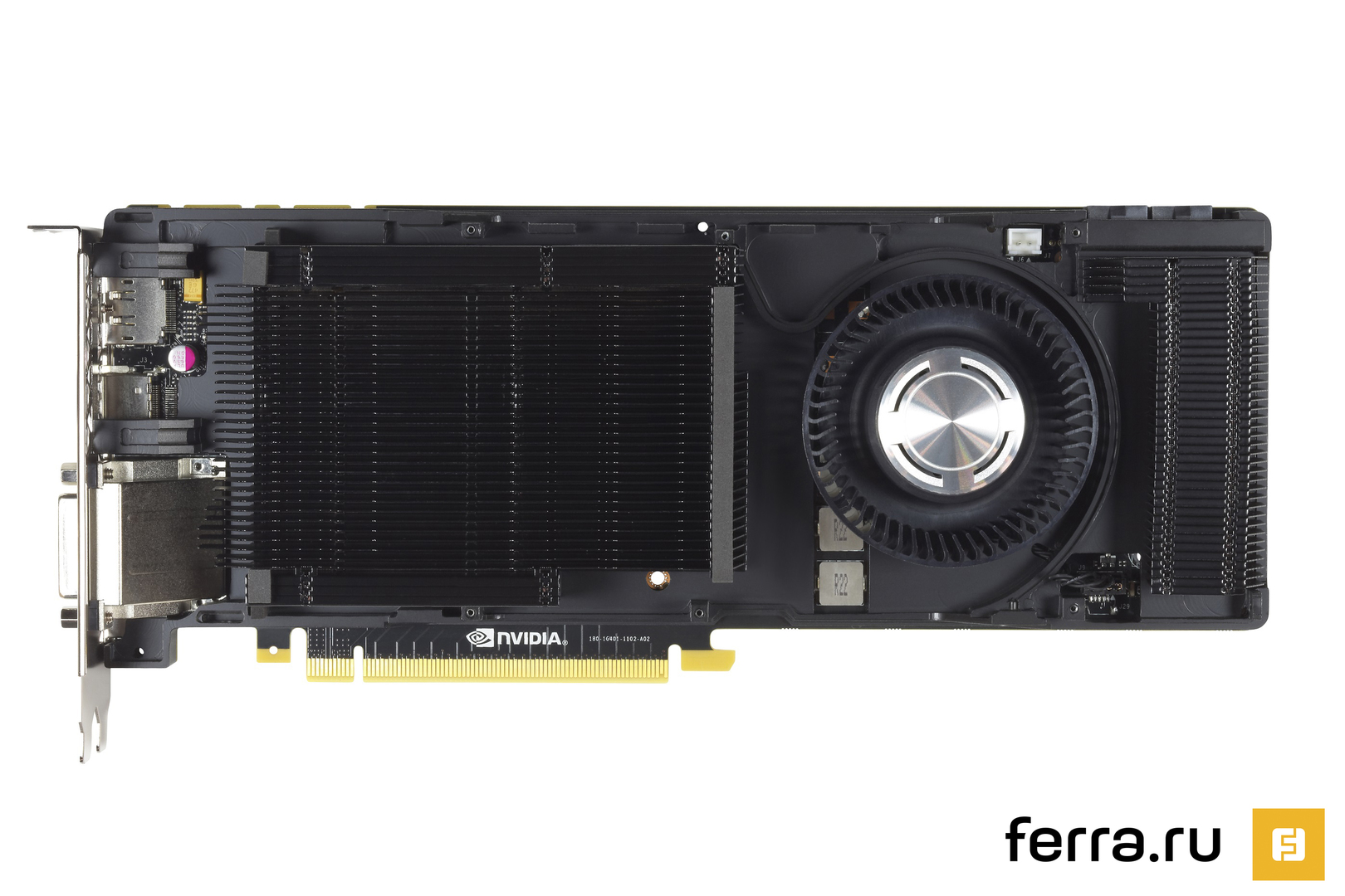 Отличить референс GeForce GTX 980 от другой дефолтной модели NVIDIA позволит лишь надпись на кожухе. Карта по-прежнему занимает два слота. А на торце красуется LED-индикатор GEFORCE GTX, светящийся во время работы завораживающим едко-зеленым цветом.