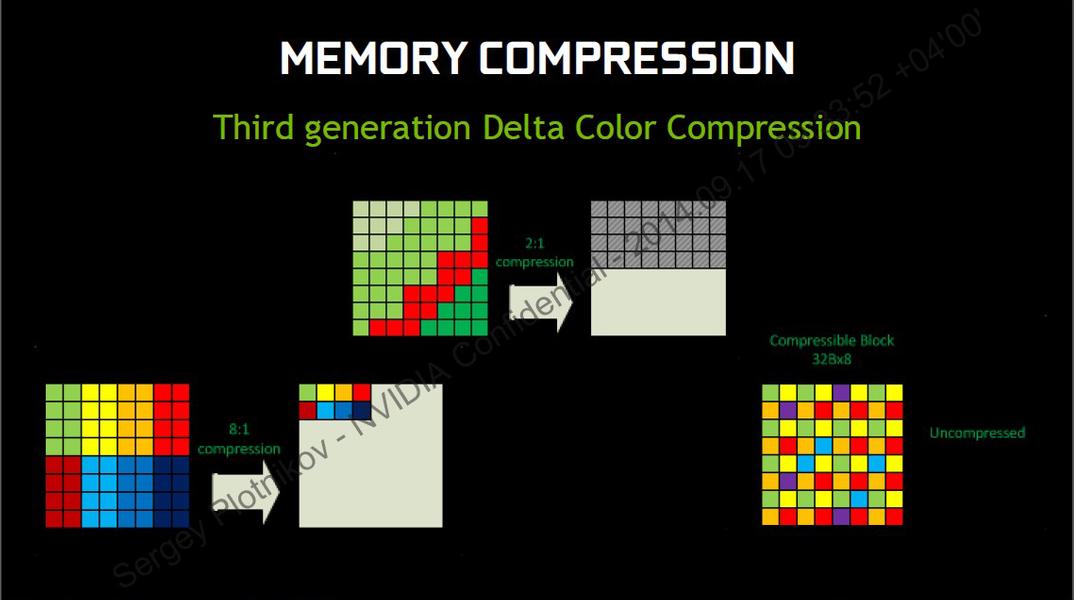 Графический процессор GM204 имеет 64 ROP. Это вдвое больше, чем у GK104. Каждый блок ROP может обрабатывать один цвет. Для уменьшения требований к видеопамяти был задействован метод компрессии без потерь. Архитектура Maxwell поддерживает уже третье поколение дельта-сжатия (первое было реализовано в Fermi). Далеко не маленькую роль играет большой кэш GPU. В проведенных тестах GeForce GTX 980 использует приблизительно на 25% меньше байтов на кадр, чем GeForce GTX 680. В итоге пропускная способность на уровне 7 Гбит эквивалентна параметру 9,3 Гбит.