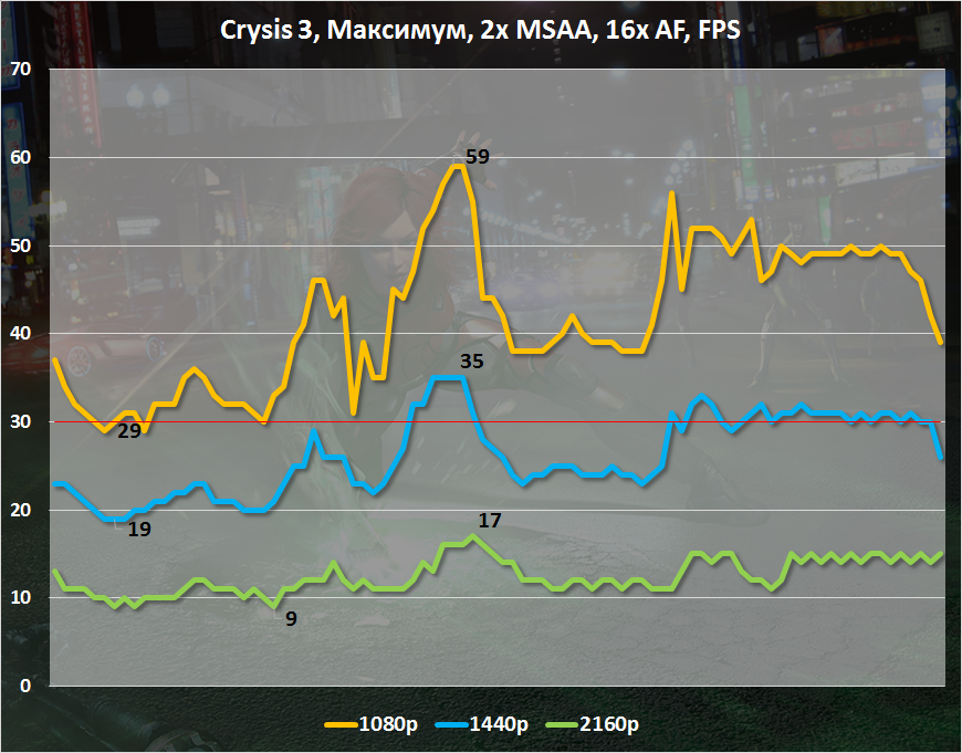 Первому Crysis совсем недавно исполнилось 8 лет! Третья часть франшизы тоже покрыта сединой, но игра по-прежнему относится к разряду одних из самых требовательных. Вот и Radeon R9 380X при заданных нами настройках качества графики выдает комфортное количество кадров в секунду только в разрешении Full HD.