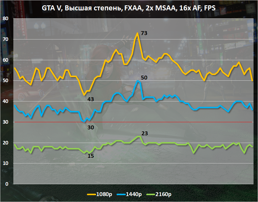 При использовании 2-кратного сглаживания и при максимальных настройках качества графики GTA V требует 2,6 Гбайт видеопамяти в Full HD и 3 Гбайт в WQHD. Именно в этих разрешениях Radeon R9 380X способна выдать играбельный уровень FPS.