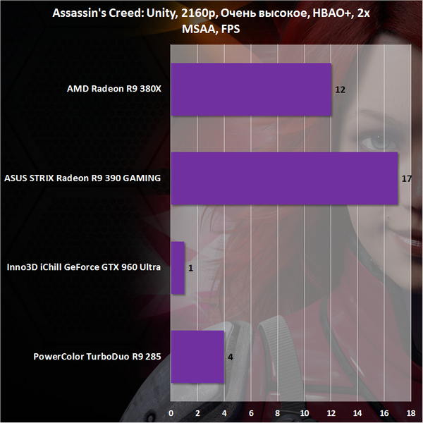 Начнем, пожалуй, с самых ресурсоемких приложений современности. А именно с двух версий Assassin’s Creed. Работают они на одном движке, кстати. Это заметно невооруженным взглядом, так как при одинаковом уровне настроек качества графики средний FPS в играх оказался сопоставимым, хотя многие игровые журналисты отмечают, что по качеству изображения Unity выглядит лучше. Понятно, что Assassin’s Creed — это конвейер. Но за год, на мой взгляд, разработчики могли бы и лучше оптимизировать игру, ведь за отведенное время никаких прорывных технологий ни со стороны AMD, ни со стороны NVIDIA не вышло.