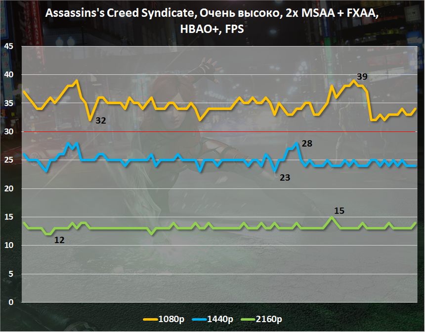 Но вернемся к производительности. При далеко не самых высоких настройках (самый высокие положат на лопатки даже GeForce GTX TITAN X) запаса прочности Radeon R9 380X хватает, чтобы обеспечить комфортный уровень FPS только в разрешении Full HD. Отмечу, что уже в 1080p при заданном качестве графики Assassin’s Creed Syndicate требует 3 Гбайт видеопамяти. В WQHD — 3,5 Гбайт, в Ultra HD — 4,8 Гбайт. Так что, повторюсь, 4 Гбайт видеопамяти — это тот необходимый минимум даже для Full HD.