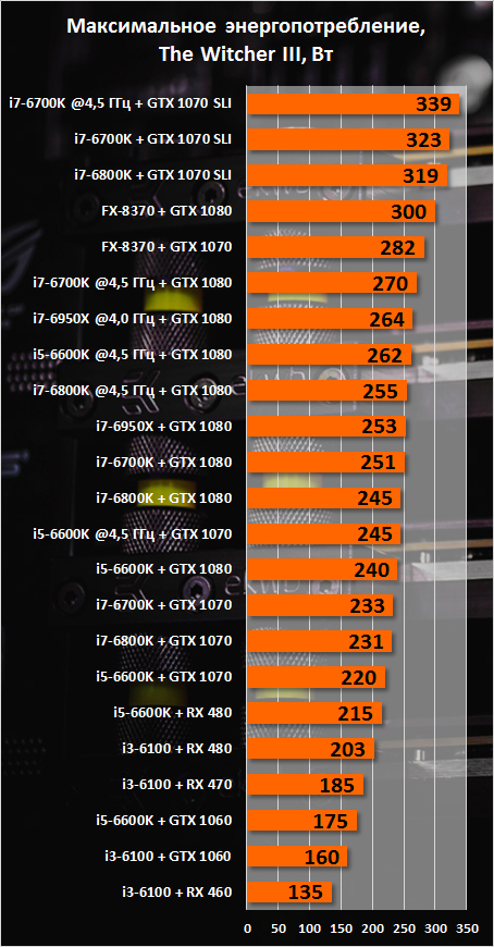 А сколько потребляет современная игровая система? Вот не верят, когда говоришь, что тому же Core i7-6700K и одной GeForce GTX 1080 в разгоне вполне достаточно блока питания на честные 450 Вт. Для большей наглядности приведу три графика с реальными измерениями. Для теста я использовал ваттметр watts up? PRO, который ведет лог потребляемой мощности. Указаны пиковые параметры. В первом случае нагрузкой служила игра «Ведьмак 3». Во втором случае — одновременный запуск LinX 0.6.5 и FurMark. На крайнем правом графике отображена пиковая мощность системы — сумма уровня типичного тепловыделения процессора, максимального энергопотребления видеокарты и дополнительных 100 Вт, отведенных под нужды материнской платы, оперативной памяти, корпусных вентиляторов и накопителей (с запасом).