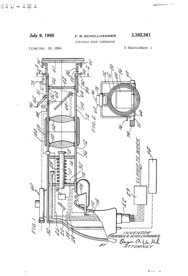 10 июля 1968 года в США был зарегистрирован патент на лазерный бластер (пистолет). В патенте описывался метод работы «портативного генератора луча», который не требовал подключения к электросети, а принцип работы оружия основывался на свойствах импульсного лазера, состоящего из компактного источника накачки и резонатора. Подразумевалось, что такой пистолет был в состоянии изредка производить лучевые выстрелы и очень неуклюже перезаряжаться лампами, необходимыми для ведения огня.