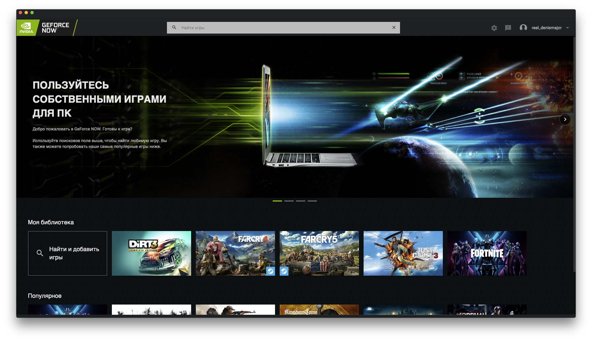 Из самого приложения уже можно искать и устанавливать игры. Только вот сервис поддерживает не так уж много игр - к примеру, на момент написания статьи поиграть в “Ведьмак 3” у вас не получится. Но что важнее всего - как и у других облачных сервисов, платный доступ к GFN не подразумевает возможность играть в платные игры. То есть, если вы уже покупали игры в Steam/Uplay/Epic Games Store - то можете играть оплачивая только подписку на GFN (если сама игра поддерживается сервисом). Если где-то в другом месте, придётся повторно покупать в одном из описанных выше магазинов или играть в бесплатные.