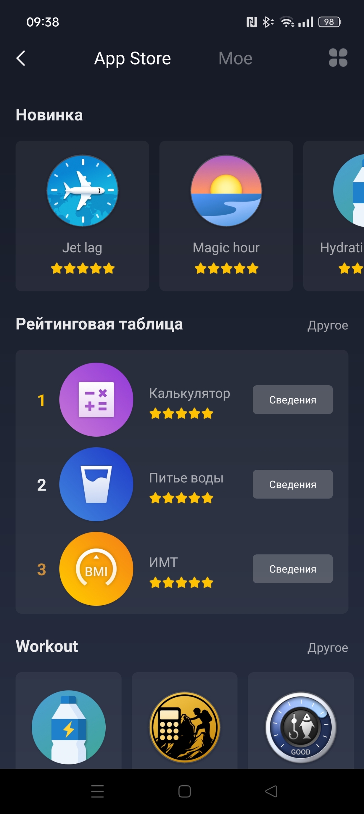 В-третьих, в приложении Zepp на часы можно поставить разные приложения, среди которых даже есть простые игры. Библиотека небольшая, но всё-таки это позволяет кастомизировать Amazfit Active под ваши нужды. Например, имеется калькулятор, счётчик воды (сколько вы пьёте), запись температуры тела, пара-тройка незамысловатых игр.