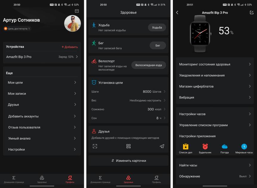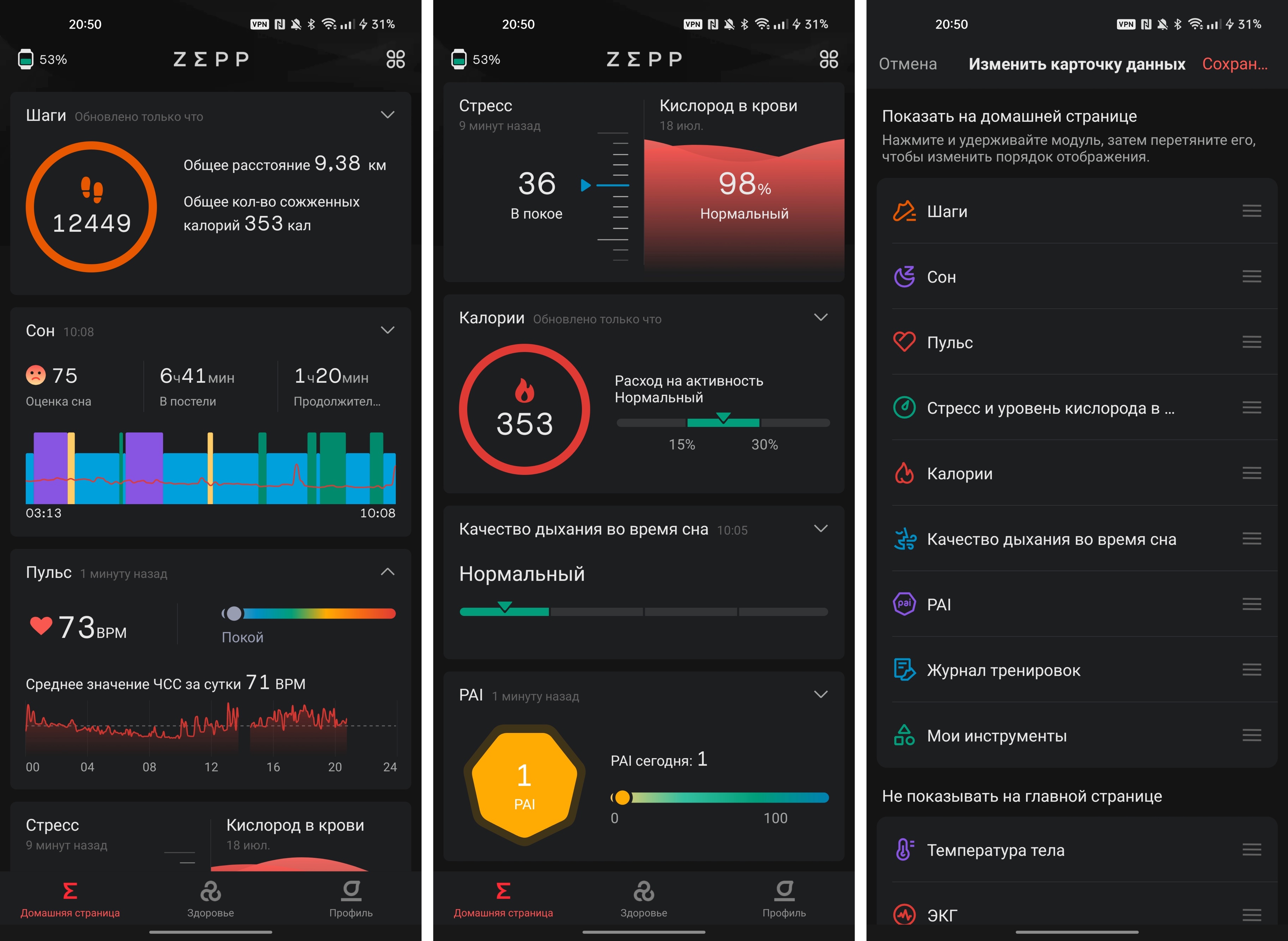 Настройки, опции, собранные данные, циферблаты — все это в приложении Zepp для iOS и Android. На главном экране расположены виджеты с показателями здоровья, причем все разделы сопровождаются справочной информацией, также есть возможность настраивать их очередность, подключать дополнительные и отключать ненужные модули. В целом все получилось достаточно гибко, информативно и удобно в использовании. А еще один плюс — нормальная локализация, в которой я не встретил кривых переводов на русский, которые бы заставляли гадать, что же написано в оригинале.