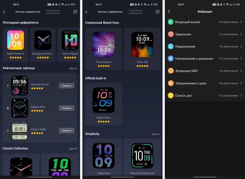 Все циферблаты собраны именно в Zepp, менять их с часов не выйдет. Судя по всему, из-за ограниченной памяти устройство умеет хранить только один стандартный и один дополнительный циферблат. Загрузка нового происходит с заменой текущего. В целом выбор большой: более 50 цифеблатов в разных стилях, причем многие еще и с возможность настаивать отображаемую информацию.