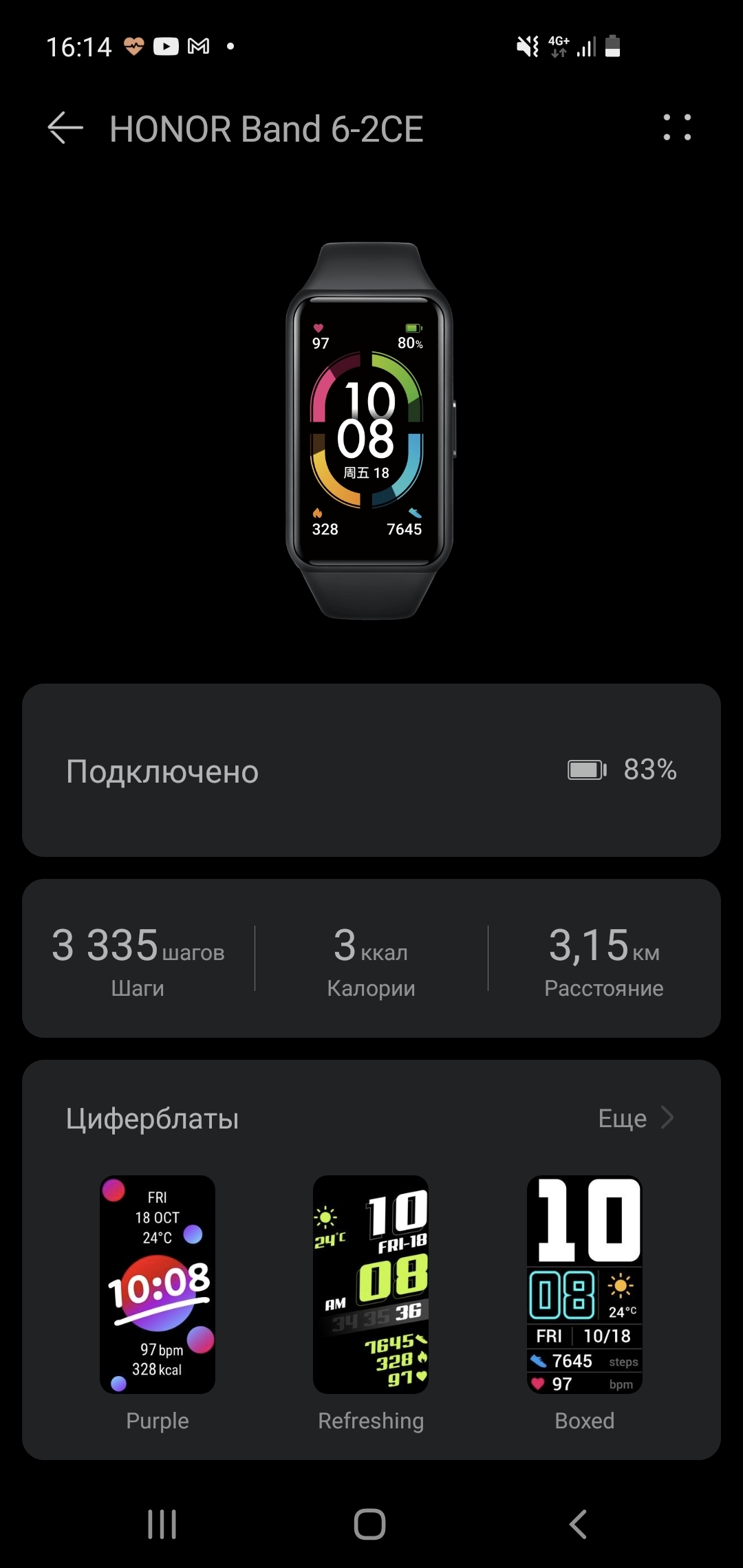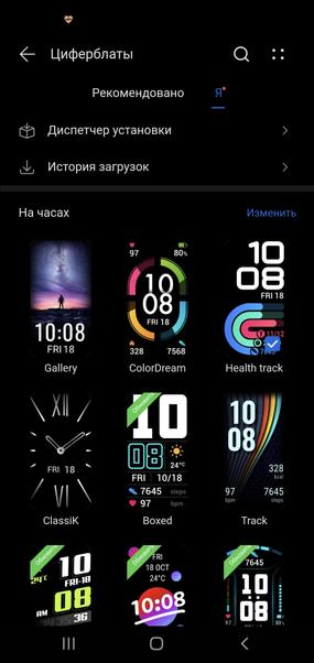 В приложении можно управлять настройками браслета и загружать новые циферблаты. Последних много — на любой вкус, от минималистичных и чёрно-белых (экономят заряд, между прочим) до пёстрых и информативных. Некоторые из них можно даже настраивать — какую именно информацию отображать в конкретном блоке.