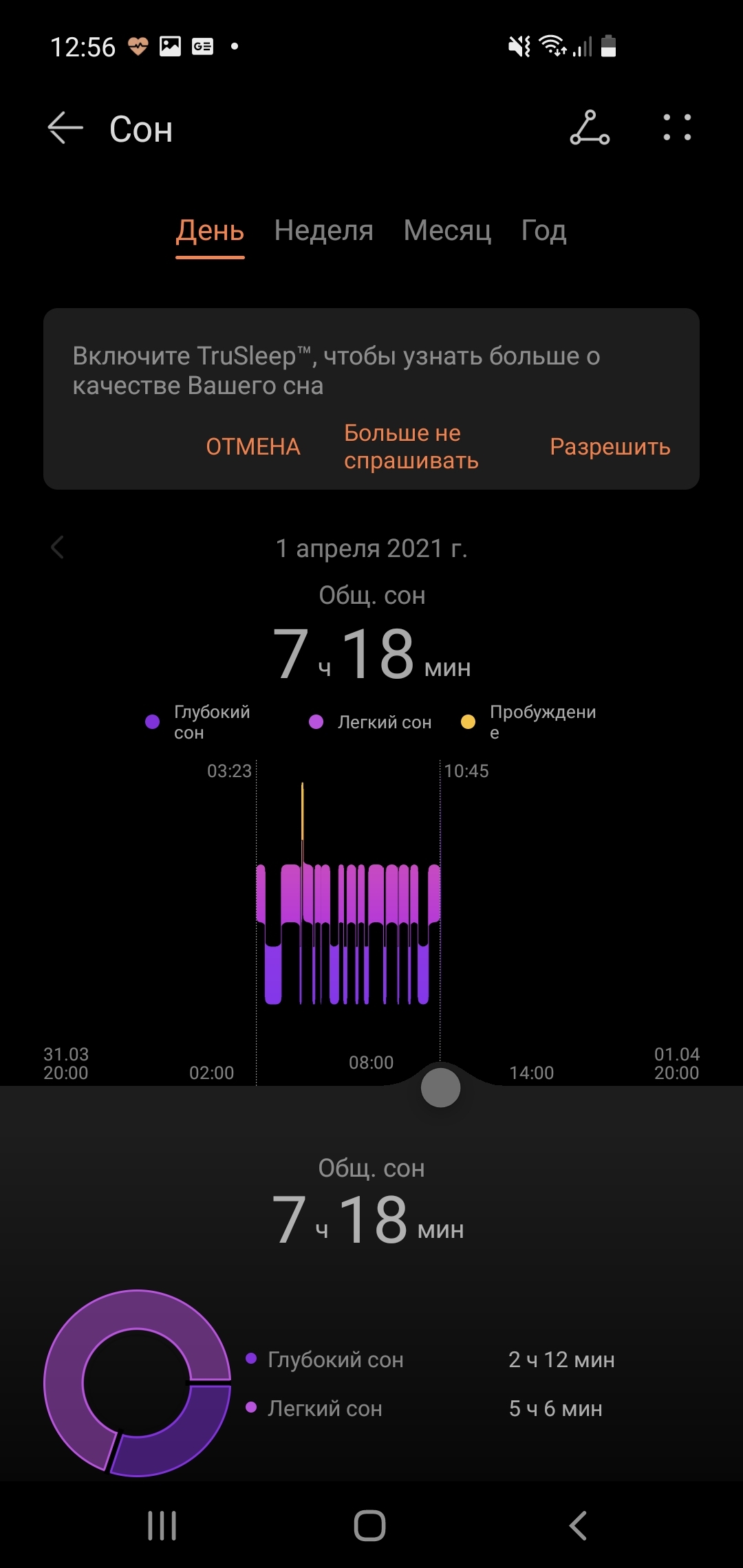 Также только в приложении можно смотреть данные мониторинга сна, сам браслет лишь присылает уведомление, что отчёт готов.