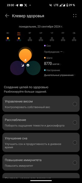 Но отвлечёмся от обругивания насыщенного функциями приложения и перейдём ко второй его части — для достигаторов-спортсменов. Для тех, кто может поднять с себя с дивана и не только любоваться красивыми графиками, можно настроить цели или вести отчётность по тренировкам.
