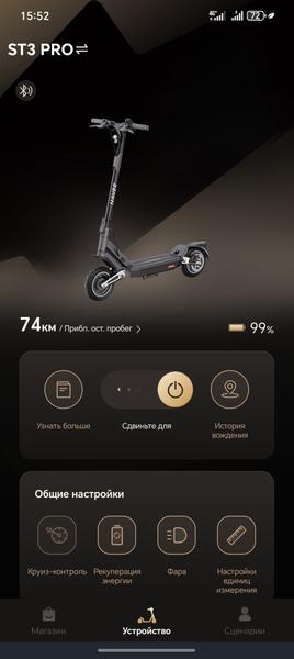 Если прошлогодние модели не всегда могли нормально присоединиться к телефону, то тут таких проблем я не обнаружил. Открыл приложение, включил самокат — все работает. Внешний вид приложения с прошлого года тоже успели обновить — выглядит понятно, еще и дизайн актуальный.