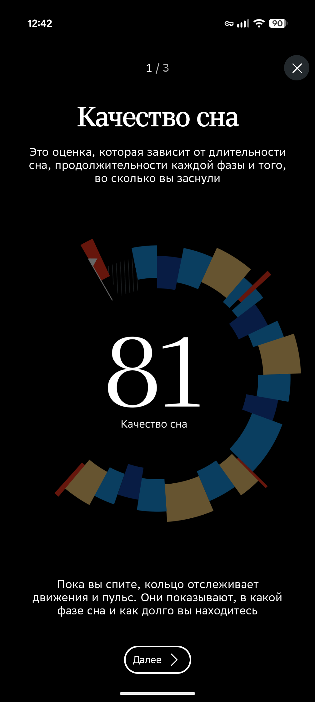 - Качество сна. Кольцо фиксирует время засыпания, длительность фаз медленного (лёгкого и глубокого) и быстрого сна, а также количество пробуждений.