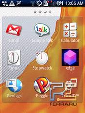 Привычный интерфейс Android здесь отсутствует, вместо него — собственная разработка Sony Ericsson, название которой почему-то нигде не фигурирует. Здесь мы имеем три страницы, на которые можно ставить виджеты (и нельзя ставить ярлыки). Главная страница рабочего стола отображает часы и четыре пиктограммы для быстрого доступа к основным функциям. Под основными функциями в данном случае подразумевается адресная книга, сообщения, звонилка и музыка. Главное меню "выезжает" снизу и листается не вертикально, как заведено, а горизонтально. Изначально это четыре страницы с матрицей иконок 3х3, но, по мере установки дополнительного софта, "длина" главного меню растет.
