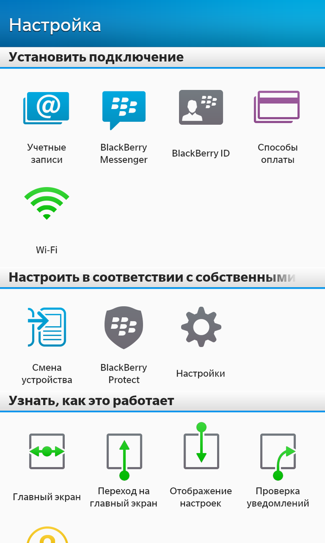 Нужно заметить, что всё управление смартфона сводится к свайпам, то есть к движениям пальцев по экрану. Чтобы открыть меню быстрого доступа к настройкам, надо сдвинуть сверху вниз, для доступа к Blackberry Hub — слева направо (на экране последних приложений) или снизу вверх и направо (с любого экрана). Ах да, как же попасть на главный экран? Достаточно провести с самого низа дисплея вверх и любое приложение тут же свернётся и откроет экран запущенных программ.