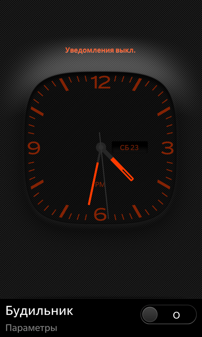 Приятно удивила возможность включения ночного режима прямо с экрана блокировки. Сдвигаем иконку с кроватью и месяцем вниз и открываются затемнённые часы (чтобы не мешать сну ярким светом) и рычажок будильника. Включаем будильник и на часах появляется ползунок, которым можно установить время пробуждения. Такого способа я ещё нигде не видел. Кстати, иконка ночного режима появляется только вечером, так что включить таким способом будильник днём не удастся, придётся лезть в настройки.