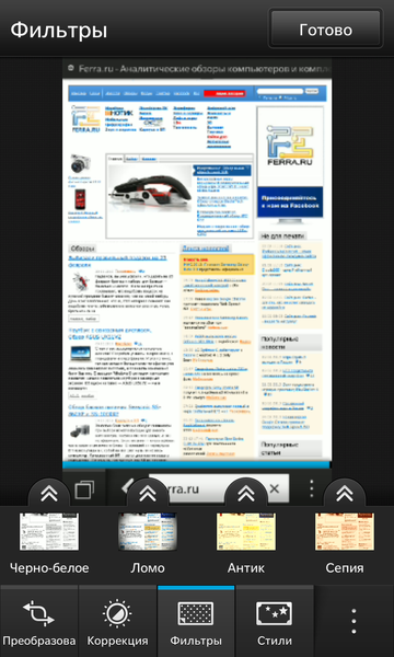 Помните, я говорил о том, что в камере почти нет настроек? Зато в BB 10 есть встроенный редактор изображений, с помощью которого можно изменить фотографии до неузнаваемости. Тут и обрезание изображений, и фильтры (гораздо больше, чем в Instagram), и стили, и коррекция, в общем, всё, что может когда-либо пригодиться.