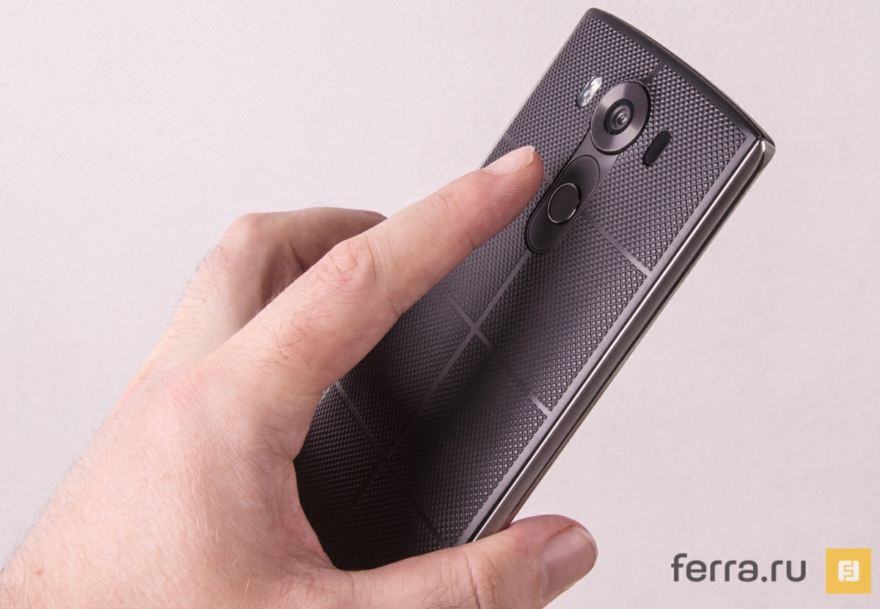 Стальные панели по бокам — украшение всего смартфона. Прочные (не особо деформируются после падения на бетон), всегда сияющие и хорошо вписывающиеся в дизайн. Как подобает металлу, они основательно отдают холодом в ладонь, а во влажной руке оказываются довольно скользкими. Но в LG V10 они изогнуты настолько продуманно, что смартфон с очень узкими боковыми рамками можно держать по-всякому, не опасаясь случайно задеть дисплей.