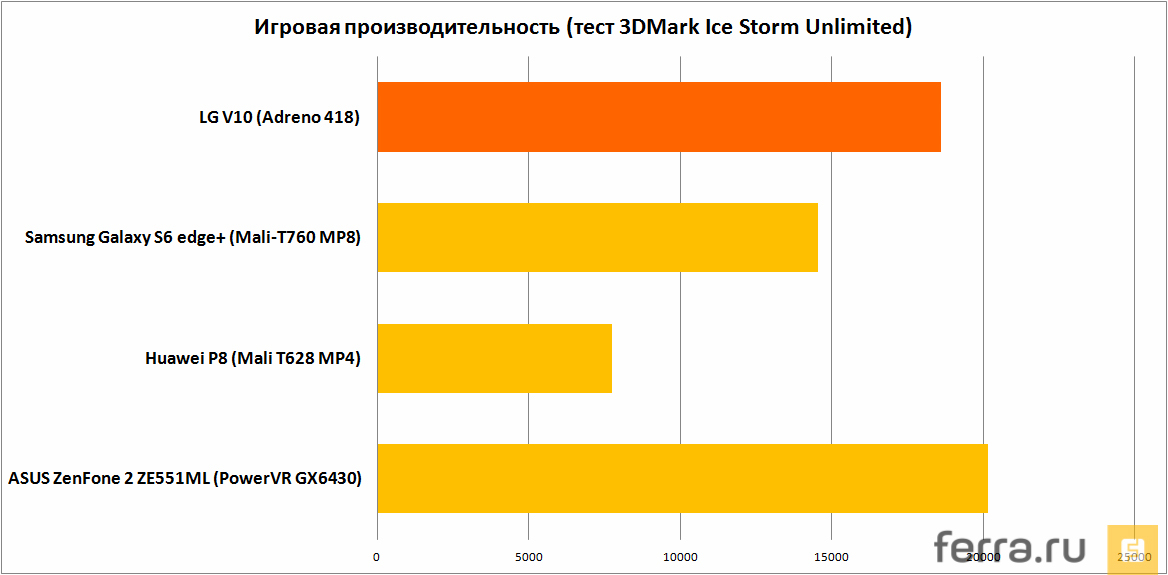 Городить экзотическое охлаждение в смартфонах со съёмными аккумуляторами и задними крышками — очень хлопотное и неблагодарное занятие, поэтому в смартфонах LG давно и прочно поселился шестиядерник Snapdragon 808. Если не брать в расчёт модули «светлого будущего» на базе нового Kirin 950 или десятиядерных MediaTek — упомянутый выше Snapdragon уступит в производительности старшему брату — Snapdragon 810 (Sony Xperia Z5, Nexus 6P) и самсунговскому процессору Exynos 7420 (Samsung Galaxy S6 edge+, Meizu Pro 5). Остальные смартфоны на рынке будут или такими же по мощности, или слабее.
