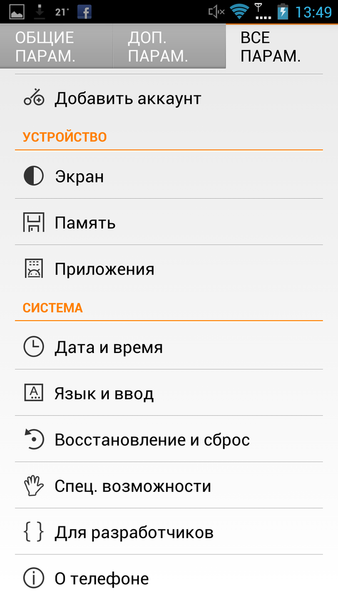 Главное меню матричного вида, 4х5, а меню настроек сепарировано на общие и дополнительные параметры, не считая общего списка (наполнение при этом стандартно — вертикальный список опций).