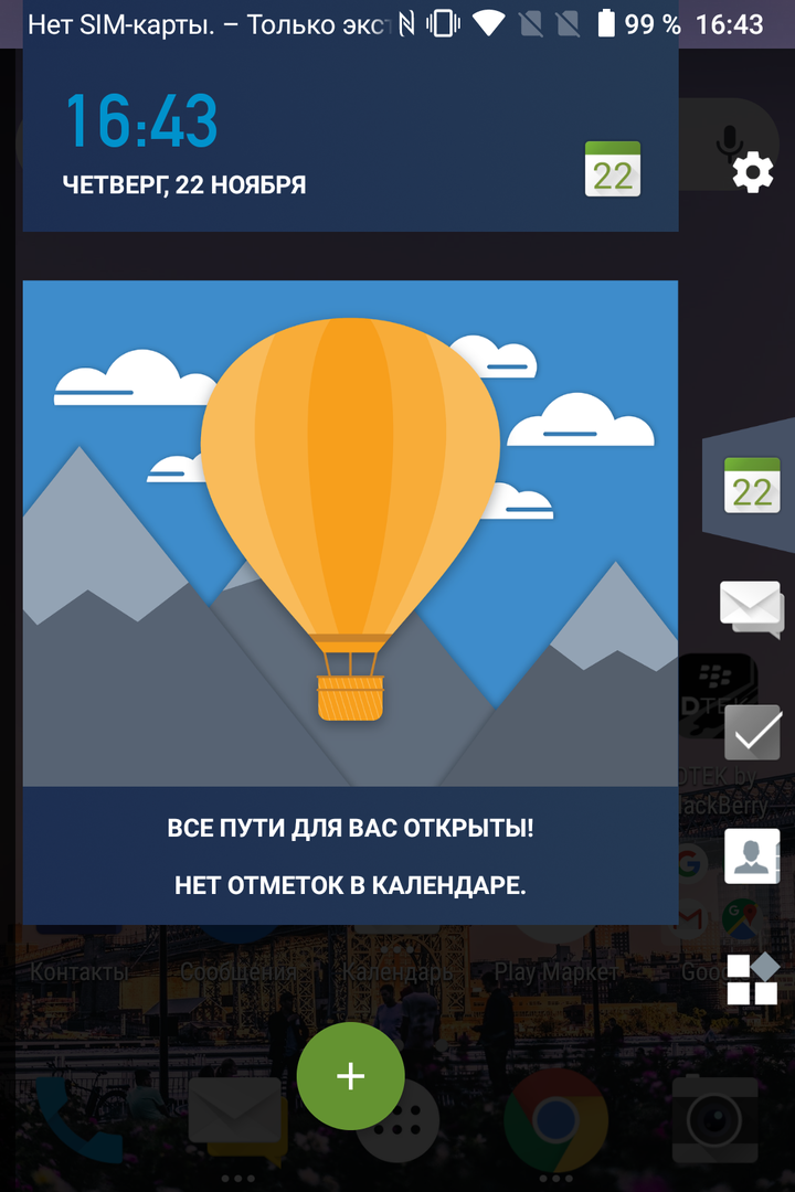 Перейдём к софту. KEY2 работает на базе чистого Android 8.1 без какой-либо своей оболочки, но с кучей своих приложений. Например, на правой границе дисплея можно увидеть небольшую закладку, потянув которую, открываешь отдельную программу, некий хаб, где собраны календарь, сообщения, список задач, контакты. Сюда же можно добавлять привычные нам виджеты различных установленных вами приложений — те же, что вы можете добавить на рабочий стол. В этот хаб можно собирать уведомления от всех мессенджеров и подобных приложений, чтобы их можно было структурировать и тем самым облегчить себе жизнь. Кроме того, он даёт возможность посмотреть даже старые и уже открытые уведомления так, будто вы их еще не открывали. Или же можно отложить уведомление, и оно вернется через определенное время или же когда вы будете в какой-то заданной локации.