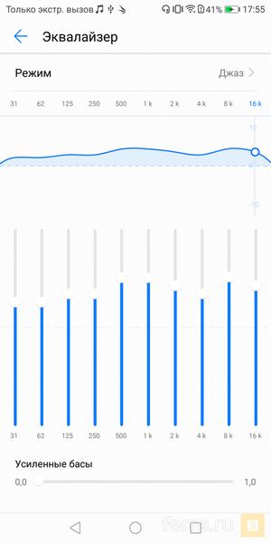Править 10-полосный эквалайзер вручную тоже можно, но особого смысла нет — с ретушированием грязно свистящих высоких частот Histen справляется и в авто-режиме. А попытки изменить звук до неузнаваемости мало к чему приведут — стоит добавить бас, как проваливается общая громкость (а её и так не очень много, если вас угораздит подключить наушники с высоким сопротивлением), добавляешь чёткости — слышишь дефекты дешёвого аудиотракта. А в хороших «мониторниках» (наушники формата «сбитый лётчик») их слышишь всегда. В общем, в «затычках» смартфон звучит неплохо, в крупногабаритных наушниках — когда как, зависит от крутизны наушников и качества аудиозаписей. Ничего криминального, если мы говорим о недорогих смартфонах, но аудиофилам явно не по адресу, и даже «полу-аудиофилам» будет проще заставить хорошо звучать Xiaomi Redmi Note 4X или Samsung Galaxy J7 (2017), чем Honor 7X. А всем остальным звук в наушниках будет казаться «нормальным», потому что он такой и есть.