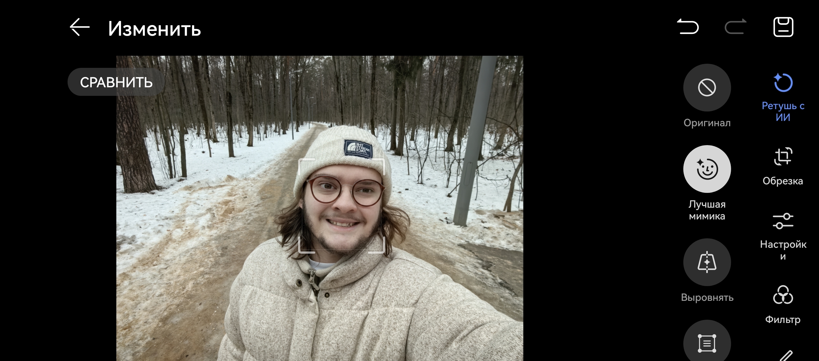 Но нельзя и пройти мимо функций ИИ. Одна из них — возможность замены лица на уже сделанных фотографиях. Как это работает? Вы делаете серию из снимков (они должны быть похожи, перетаскивать своё лицо из фоток годичной давности не выйдет), после чего заходите в галерею, начинаете редактировать снимок и в разделе «Ретушь с ИИ» нужное вам выражение лица.