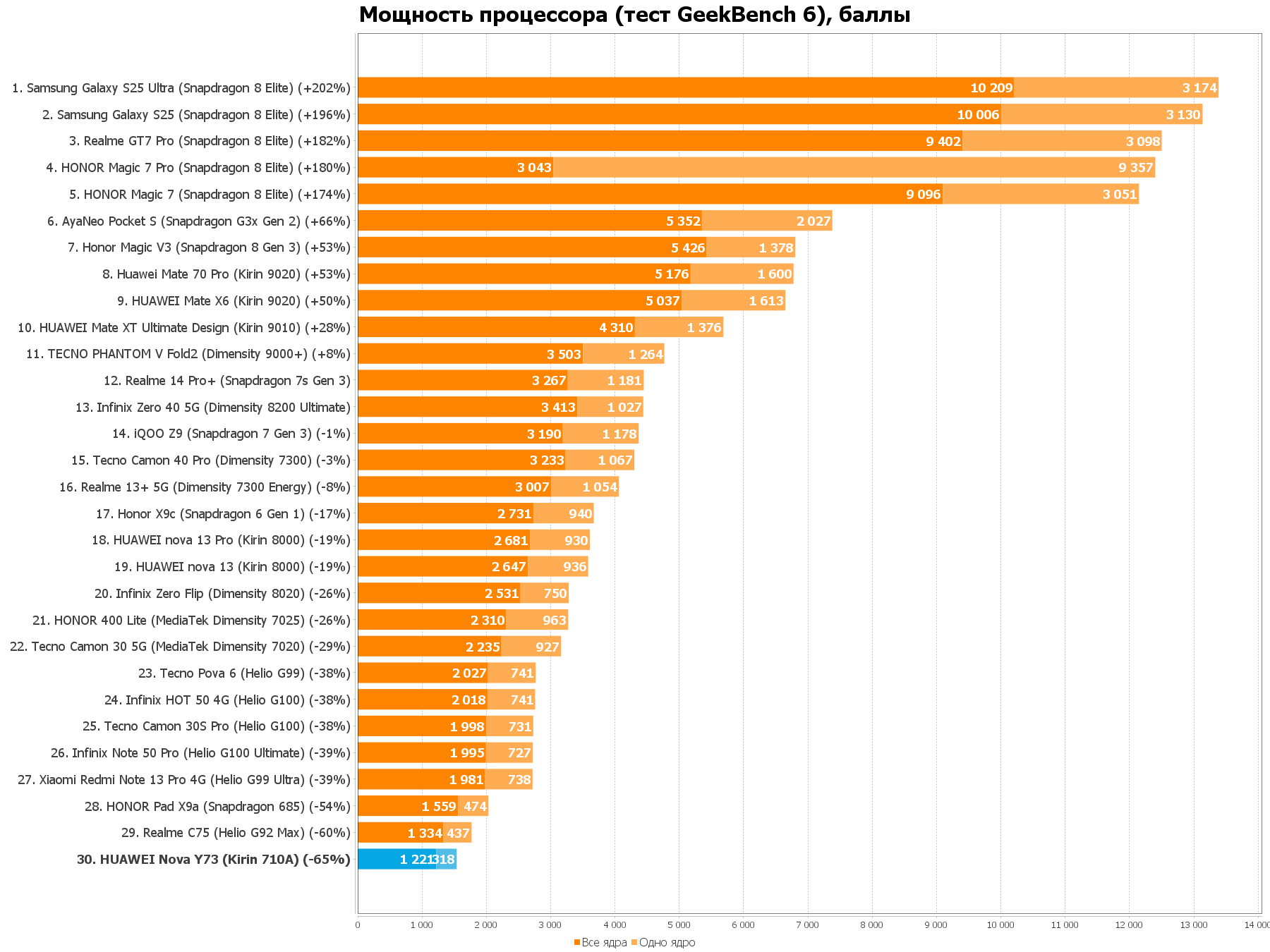 Другое дело, что, в общем-то, даже бюджетные Helio G80 и G90 серий современнее и немного быстрее. По быстродействию nova Y73 ближе к смартфонам за 10-13 тысяч, чем за 15-20 тысяч рублей.