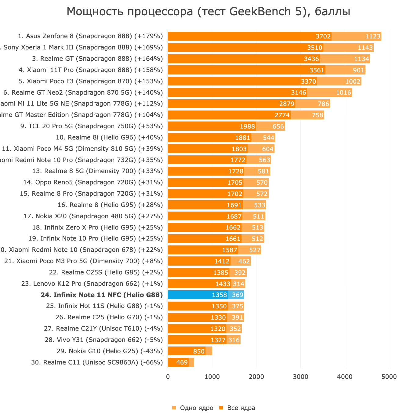 Понятное дело, что Realme 8 стал таким выгодным спустя год после выхода и ближе к концу конвейерной жизни. А у Poco M4 Pro 5G синюшный дисплей IPS и цены 22 тысячи рублей против 18 тысяч у Infinix. Но в целом-то в смартфонах с экранами похуже и 4/64 ГБ стоит такой же процессор при их (смартфонов) стоимости порядка 12-13 тысяч рублей. В Realme доплата в 5 тысяч рублей в сравнении с дешёвыми смартфонами закономерна — тут всего дофига и характеристики соответствуют, просто это далеко не самый быстрый смартфон за 17-20 тысяч, как видите в бенчмарках.