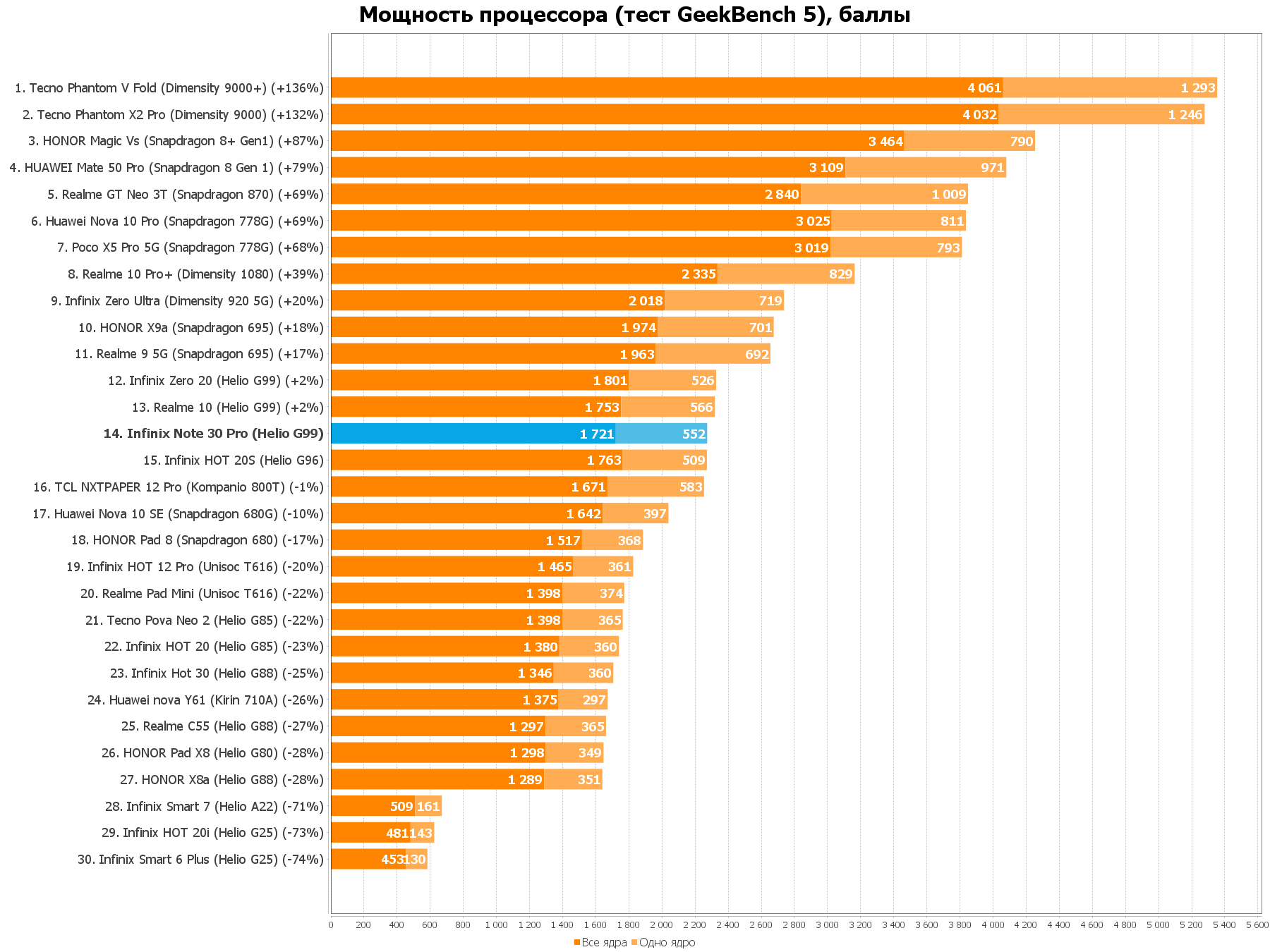 Note 30 Pro построен на прошлогоднем процессоре MediaTek Helio G99. На графиках вы сами всё можете наблюдать: это нормальный современный процессор для смартфонов от 15 до эдак 23 тысяч рублей в официальной росийской рознице (не нужно вашими дядюшками Ляо тыкать с АлиЭкспресса, о нём отдельный разговор).