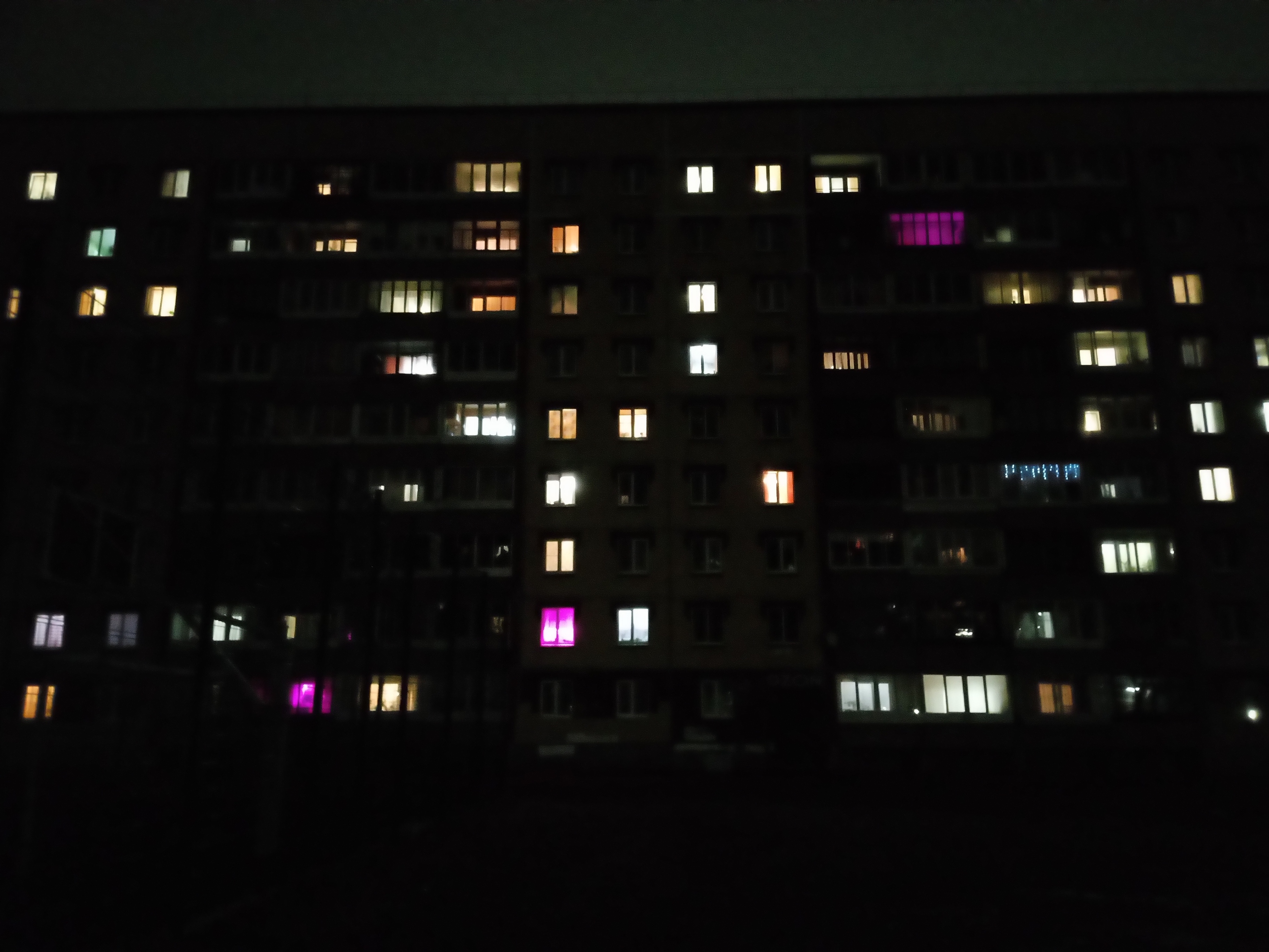 Если кратко, то ночью лучше не фотографировать. Снимки получаются смазанными, причем вне зависимости от количества света и условий съемок. Снять хорошо получится примерно ничего! Не имеет значения где вы стоите, что снимаете и умеете пользоваться телефоном вообще. Даже если экспозицию опустить до нуля, то окна советской панельки не станут более чёткими и детальными. Впервые такое вижу на современных телефонах!
