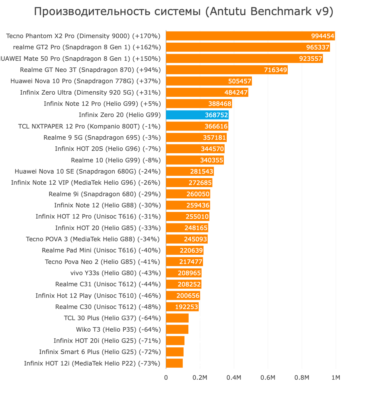 По мощности Infinix Zero 20 — крепкий средний класс. Работает на базе восьмиядерного процессора Mediatek Helio G99 (6 нм) с двумя производительными ядрами 2.2 ГГц Cortex-A76 и шестью энергоэффективными 2.0 ГГц Cortex-A55. Графика — Mali-G57 MC2. По сути, чип — это старшая модель игровой серии G для смартфонов среднего класса. Достаточно мощный, чтобы играть хотя бы на средних настройках графики даже в самые требовательные игры. При этом нельзя сказать, что очень прожорливый или склонный зарезать частоты при перегреве. С учетом выделяющейся фронталки можно было бы сказать, что Zero 20 — блогерски-творческий смартфон, но и мощность у него не подкачала. Хочется рубиться во всякие требовательные сетевые шутеры и «геншины» — да пожалуйста.