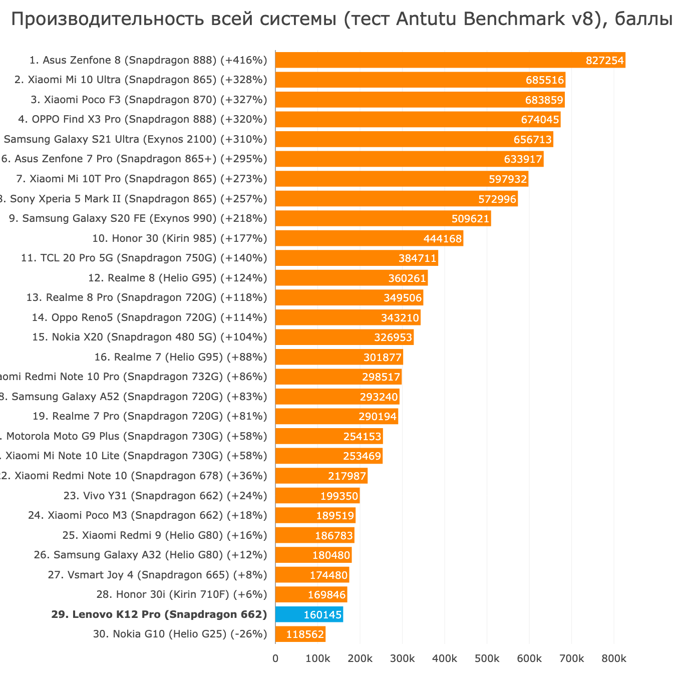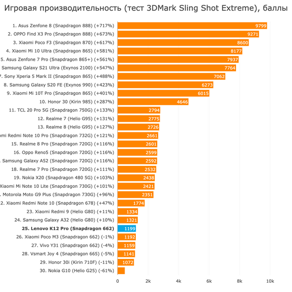 Зато и энергопотребление у этого процессора довольно низкое, как и у HD-экрана — разработчики не наврали. Lenovo K12 Pro — самый выносливый современный смартфон, что хорошо заметно по нашему рейтингу автономности среди последних тридцати протестированных смартфонов. Как видим, даже Poco M3 отстаёт с большим отрывом (видимо, сказываются обилие рекламы в фирменной оболочке и энергозатратность Full HD+ дисплея).