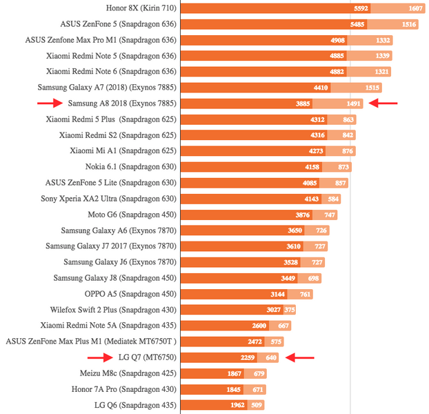 Samsung влепил в A8 процессор Exynos собственного самсунговского производства, и вот он вполне неплох — современные быстрые ядра, умеренный нагрев и энергопотребление. В итоге Samsung A8 обходит LG Q7 по всем фронтам. В том числе и по времени автономной работы.