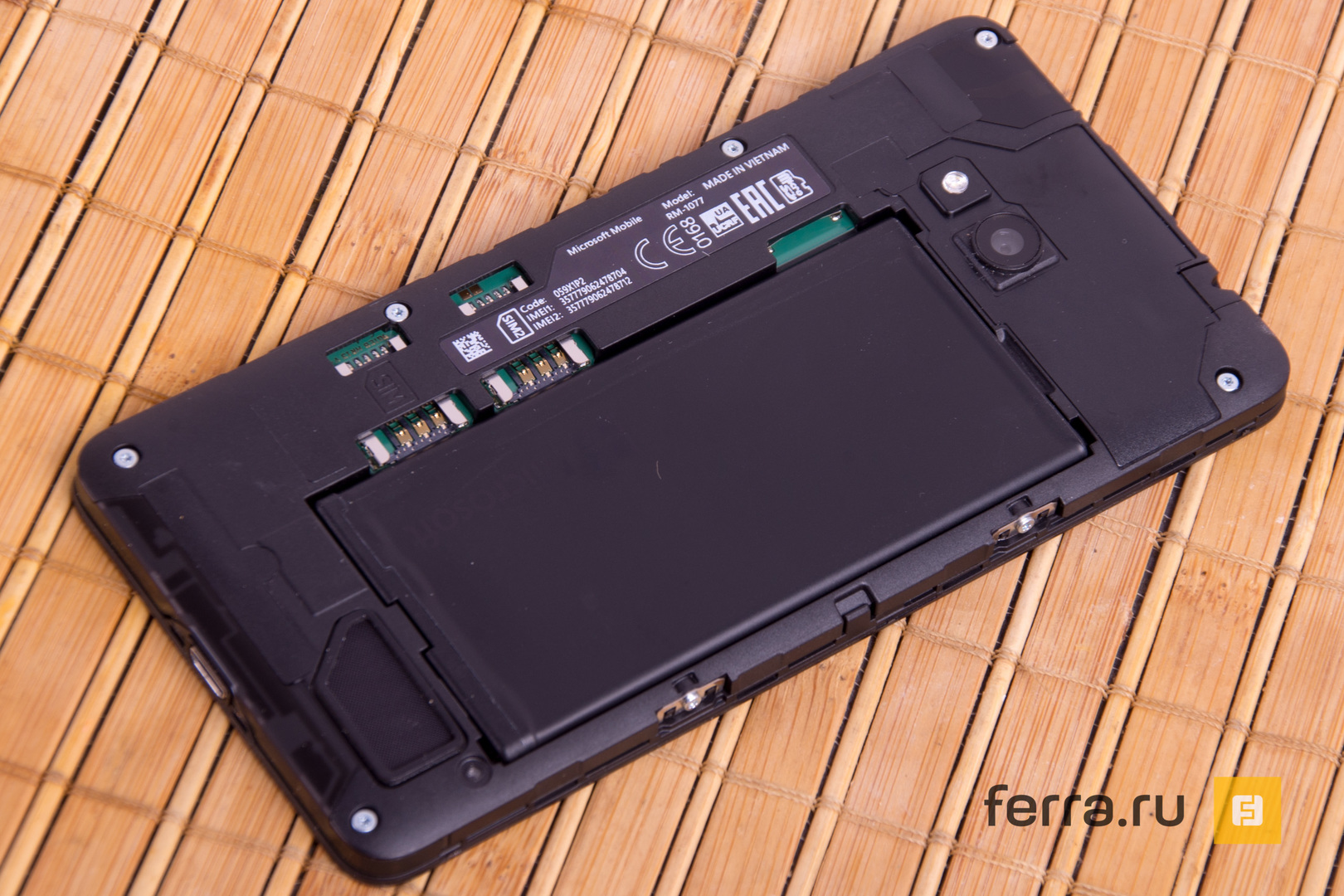 Под крышкой находится аккумулятор — тоже съёмный. Вытащив его, получаем доступ к двум слотам для карточек microSIM и флешки microSD.