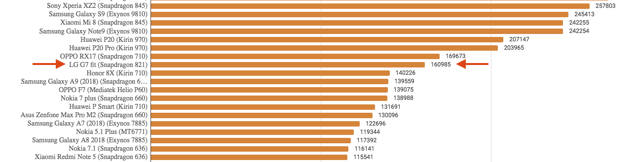 Что интересно, Snapdragon 636 имеет такую же производительность в плане CPU, хуже там только графика. При этом, в 636 оптимизировано энергопотребление. Почему LG не могла просто взять Snapdragon 636 вместо того, чтобы воскрешать "покойника" Snapdragon 821? Во-первых, потому, что Snapdragon 636 поддерживает максимум Full HD+ дисплеи. Никаких Quad HD. Во-вторых, не очень массовый G7 fit - остроумный способ распродать излишек процессоров от снятого с производства LG G6 и избавиться от груза потрохов провального (снова) по продажам G7.