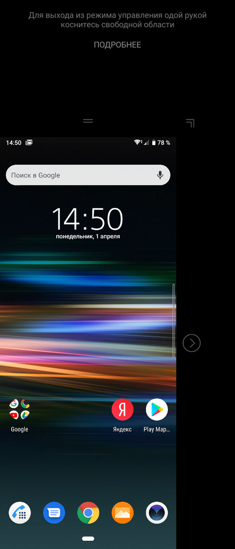 Интересно, что размер зоны “однорукого” экрана можно менять в небольших пределах - потянув за уголок. А ещё его можно пристыковывать к правому или левому краю экрана.
