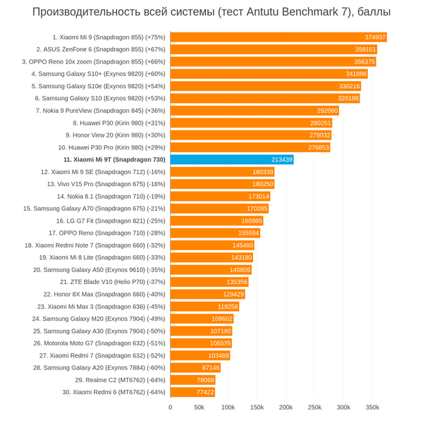 В отличие от недавнего Mi 9 SE, Mi 9T построен на более свежем процессоре - Qualcomm Snapdragon 730. В сравнении с Snapdragon 710-712, которые нам знакомы по Nokia 8.1, Xiaomi Mi 9 SE и Meizu 16, этот CPU разогнан по процессорной и графической части, поддерживает новый стандарт Wi-Fi версии 6 (если производитель влепит такой модуль, а не сэкономит и оставит старьё) и умеет записывать видео в 4K HDR. То есть, переварит даже камеры уровня Sony Xperia 1 или Samsung Galaxy S10+, чего раньше процессорам среднего класса было не позволено.
