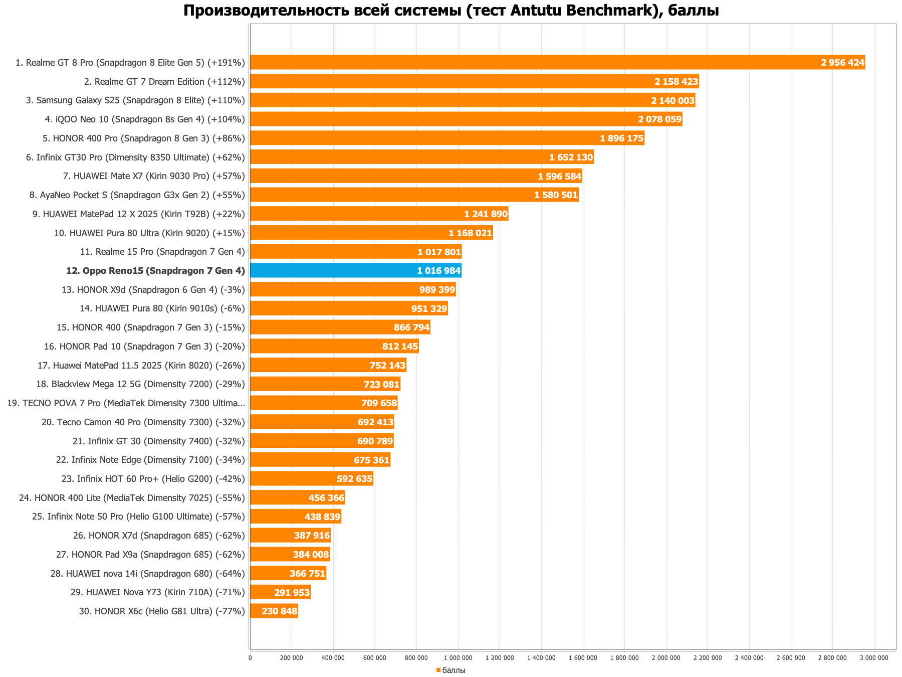 В AnTuTu v10 Reno15 набирает около 1 087 000 баллов, в v11 — уже свыше 1 400 000. В Geekbench 6 — 1188 баллов в однопоточном тесте. Для понимания: это уровень, при котором можно одновременно держать открытыми десяток приложений, монтировать короткие видео и не замечать задержек в интерфейсе. Это не территория флагманов, где Snapdragon 8 Elite набирает по три миллиона в AnTuTu, — но для задач 95% пользователей разница будет чисто академической.