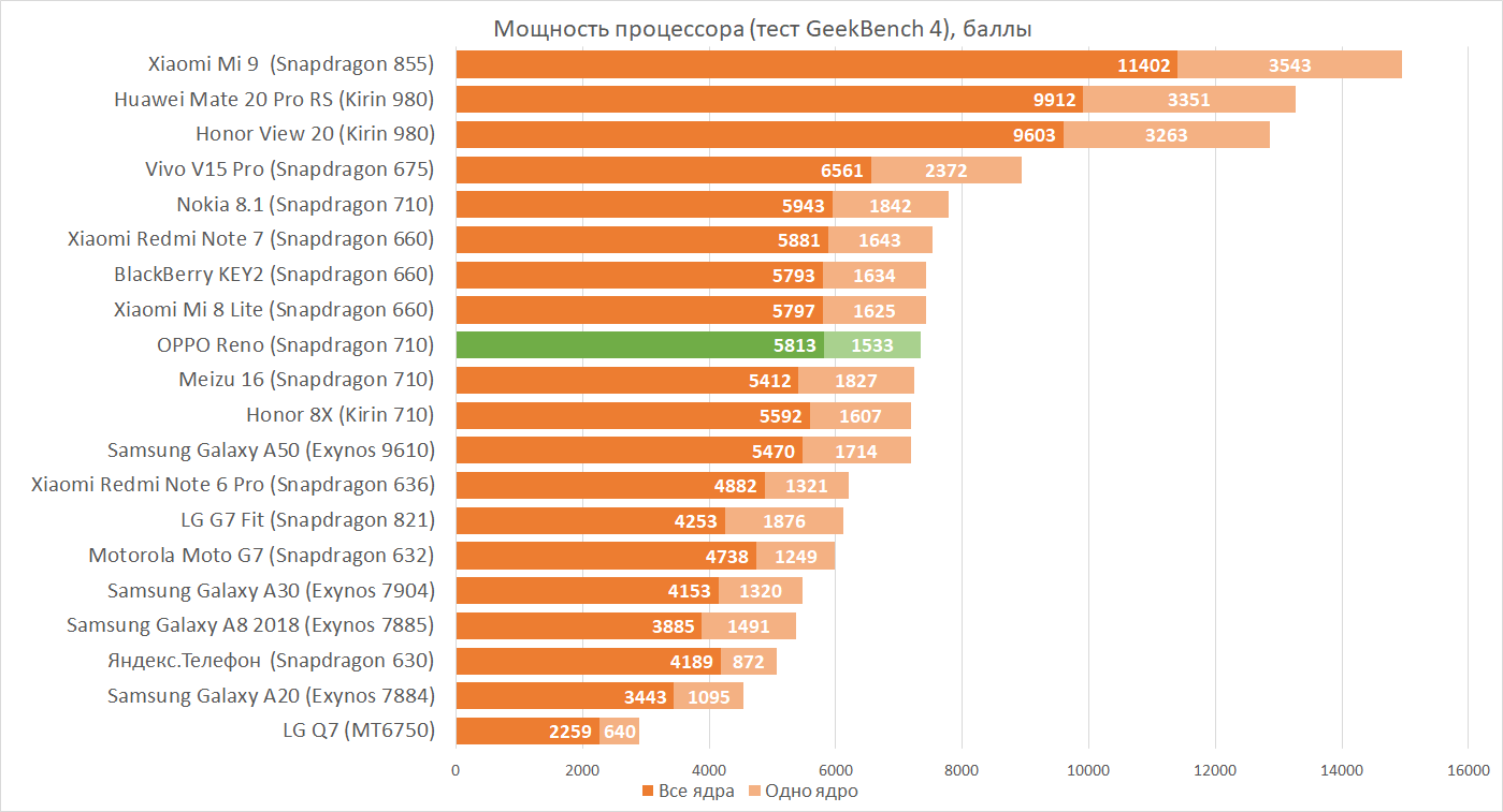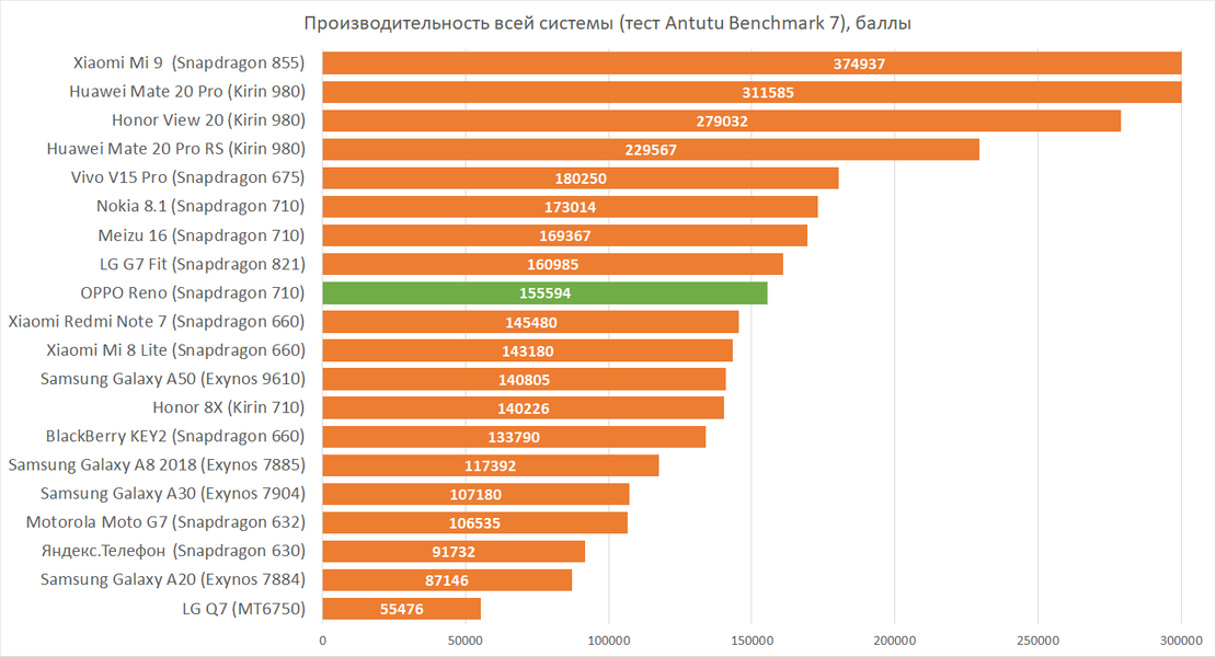 Несмотря на то, что OPPO обещает ещё более крутые смартфоны, чем Reno, характеристики на уровне и у этой серии. Например, мощный процессор среднего класса – Qualcomm Snapdragon 710. Конечно, у Xiaomi Mi 9 с его максимально быстрым Snapdragon 855 запас мощности выше, но 710-й "дракон" - это уже такой уровень, когда предел мощности ещё нужно умудриться нащупать.