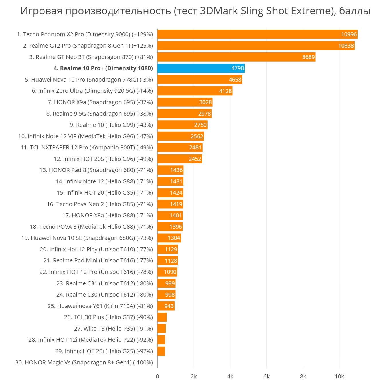 Теперь неплохой средний смартфон в представлении Realme должен быть непременно оборудован процессором производства MediaTek. В случае с 10 Pro+, речь идет о камне Dimensity 1080, который хоть и лучше, чем Helio G99, встречающегося везде в этой ценовой категории, но до почти флагманских чипов от Qualcomm все еще не дотягивает (не может тягаться с уже далеко не новым Snapdragon 870, например).