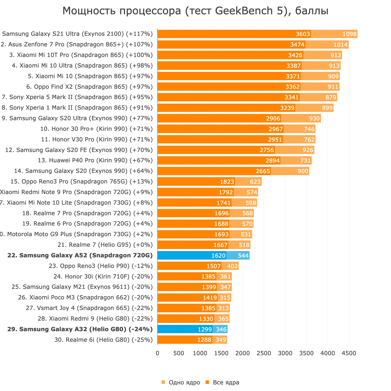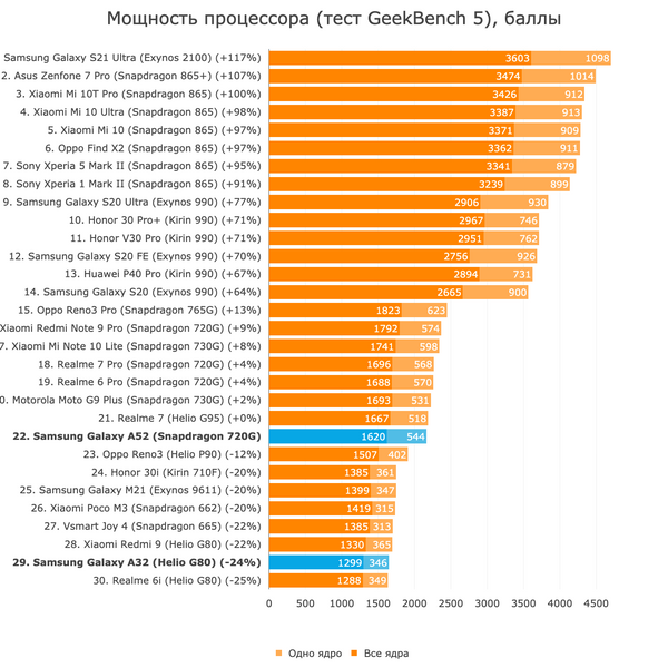 Пожалуй, самое главное, что стоит сказать о производительности (да и автономности тоже) Galaxy A52 и A32 — всё абсолютно нормально. Здесь нет непонятно откуда взявшихся неестественно больших для своего “железа” цифр, как у Xiaomi Mi 10 Ultra, и нет явной недостачи автономности, как у Asus из-за плохой оптимизации софта. И A52, и A32 расположились на наших графиках ровно в тех местах, где их можно ожидать, учитывая характеристики.