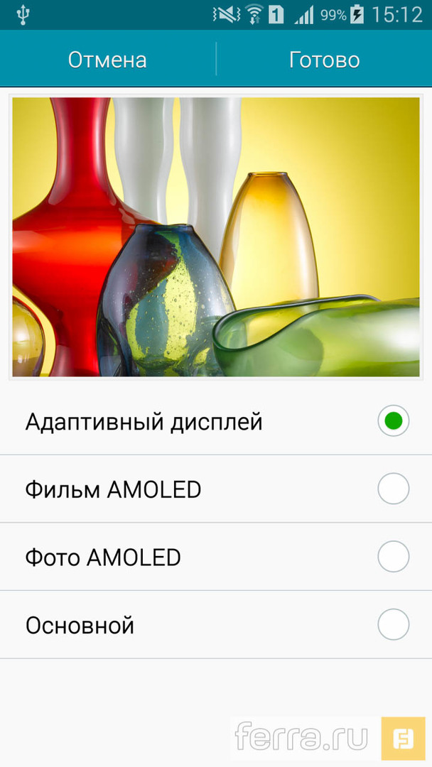 Для тех, кого раздражают насыщенные оттенки, характерные для матрицы Super AMOLED, производитель разработал несколько предустановок цветопередачи. Почитатели картинки IPS— дисплеев могут смело выбирать режим «Основной» – картинка потеряет былую агрессивность, а цвета приблизятся к эталонным для редактирования фото или видео. Режимы «фильм AMOLED» и «фото AMOLED» уже вновь эксплуатируют характерные для матрицы особенности, причём «фильм» отличается наиболее зрелищными настройками с небольшим перекосом в холодные оттенки. «Адаптивный дисплей» регулирует цветопередачу на усмотрение Samsung, правда, лишь в пределах стандартных приложений.