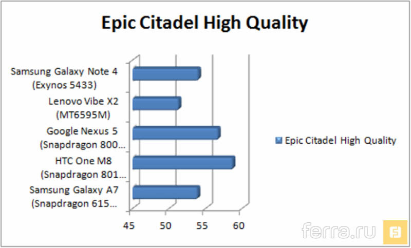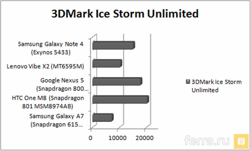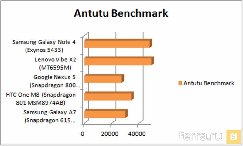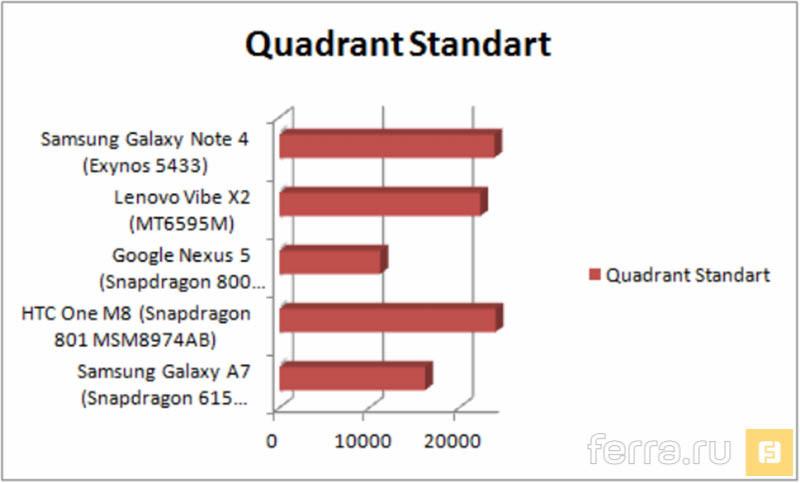 В результате, в сравнении с тем же MT6592, которым оснащаются флагманы брендов второго эшелона, экономичный Snapdragon оказывается мощнее на 20% в графических дисциплинах, и на 5% слабее в процессорной производительности. А вот рядом со Snapdragon 805, установленным в Sony Xperia Z3, HTC One M8 и некоторых версиях Samsung Galaxy S5, аппаратная начинка героя нашего теста оказывается практически на четверть слабее. В итоге результаты Snapdragon 615 оказалис наиболее близки к топовому чипу 2013 года — Qualcomm Snapdragon 800.
