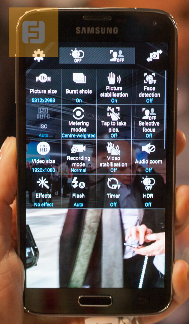 Основная камера обладает разрешением 16 мегапикселей, поддерживает функцию съемки Ultra HD видео со скоростью 30 кадров в секунду и HDR в реальном времени, как для фото, так и видео. Также предусмотрены пара новых режимов, включая Selective Focus, аналогичную Nokia Refocus Lens, для выборочной фокусировки на определенных участках снимка и размывания фона уже после съемки. По словам производителя, Samsung Galaxy S5 стал обладателем самой быстрой системы автофокусировки, которая срабатывает буквально за 0,3 секунды. Фронтальная камера получила разрешение 2,1 мегапикселя.