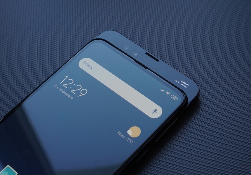 Механизм слайдера сделан здесь для того, чтобы обеспечить максимально растянутый на передней панели экран без всяких “чёлок”. Поэтому фронтальная камера с датчиками глубины расположена на выдвижной половинке.
