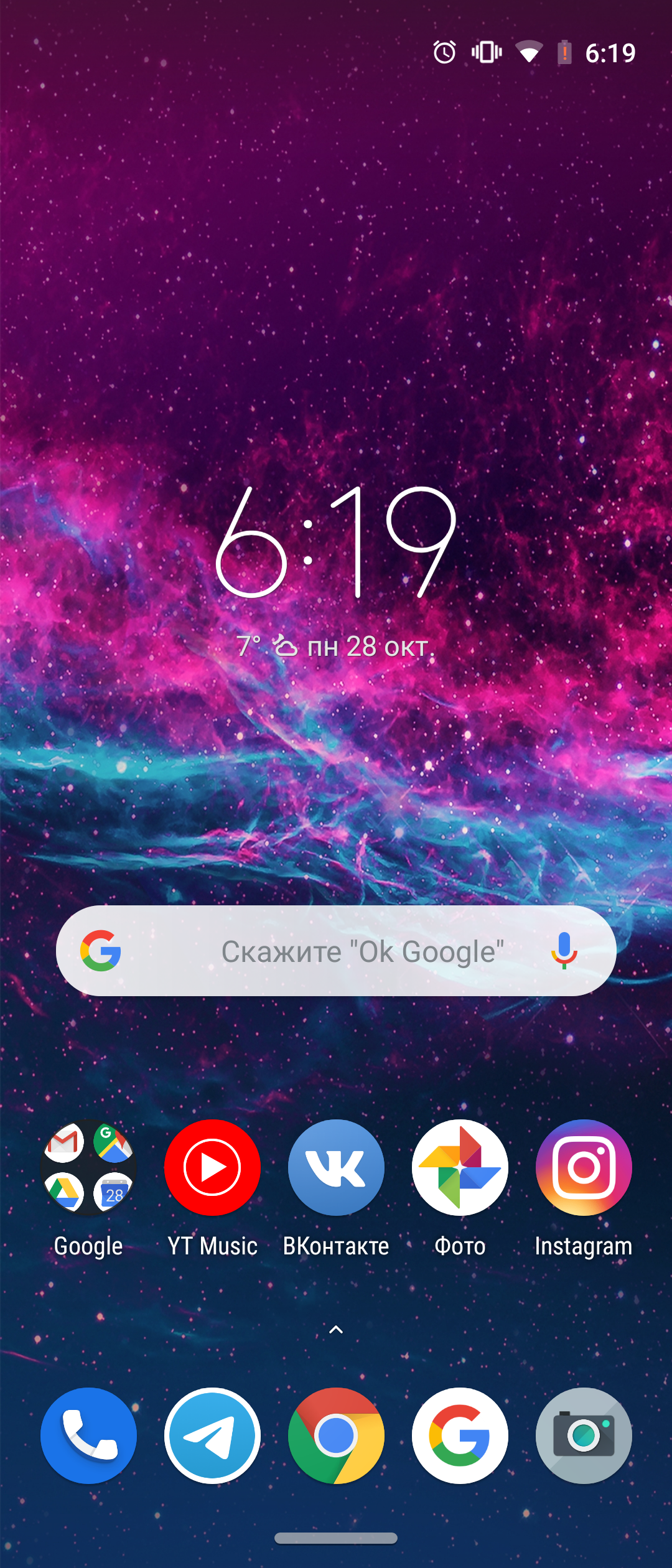 Мы с вам ещё обязательно поспорим о том, какие вырезы или выезжающие части должны быть в безрамочном мобильнике, но круглый вырез под селфи-камеру в углу при остальном дисплее с нормальными пропорциями кажется мне хорошим вариантом. Уж поинтереснее свисающей по центру «сопли», как в большинстве смартфонов дешевле 20 тысяч. Даже странно, что такой вариант компоновки лицевой панели есть только у конкурентов за 28 (Honor 20) или 33+ (Samsung Galaxy S10e) тысяч рублей.